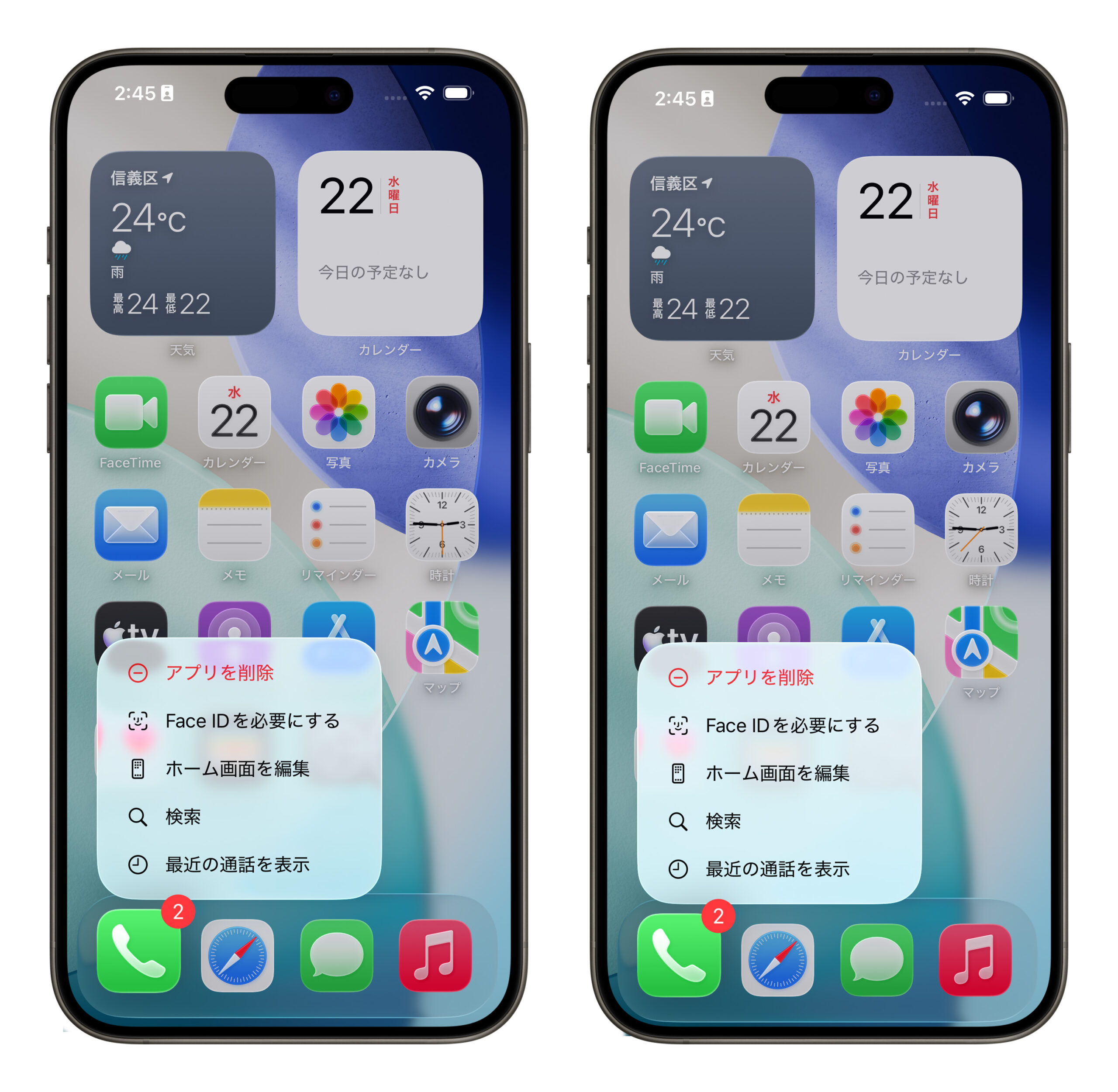 下の比較では、左が「色合い調整」、右が「透明度を下げる」モードです。左は背景がぼやけてはいるものの Dock は透けて見えますが、右は背景のディテールがほとんど見えないほどに曇っています。