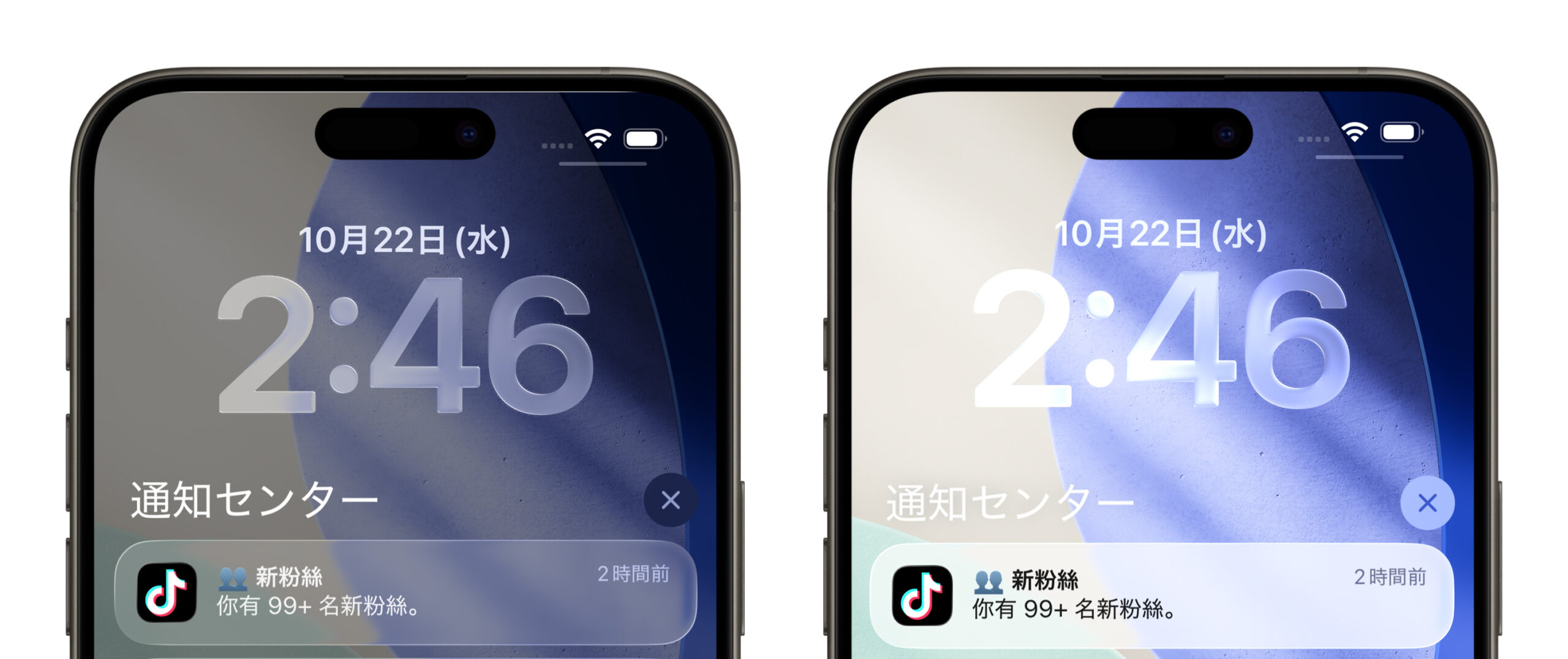 ロック画面では、以前は通知の背景が透明で文字が白だったため、視認性を確保するために全体が暗く表示されていました。しかし、「色合い調整モード」にすると、通知の背景はグレーがかった不透明な白に変わり、文字も黒に切り替わることで、背景全体を暗くする必要がなくなります。