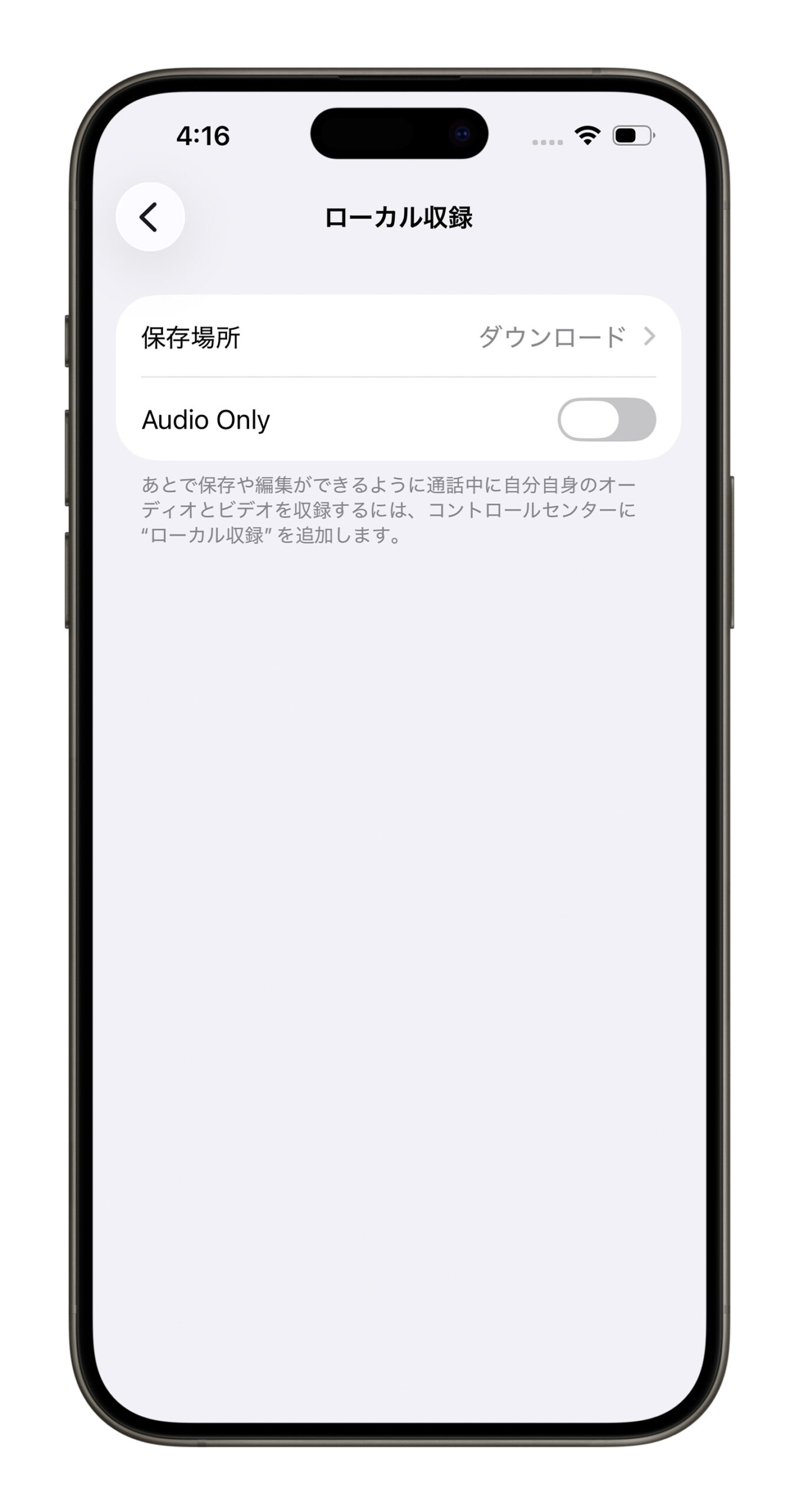 「ローカル収録」は、ビデオ会議中に自身の音声と画面を録画できる機能です。iOS 26.1 では「設定 > 一般 > デバイス上で取得」で、録画ファイルの保存場所を選択可能になり、「音声のみ(Audio Only)」という選択肢も追加されました。音声のみを保存したいユーザーにとって便利な機能です。