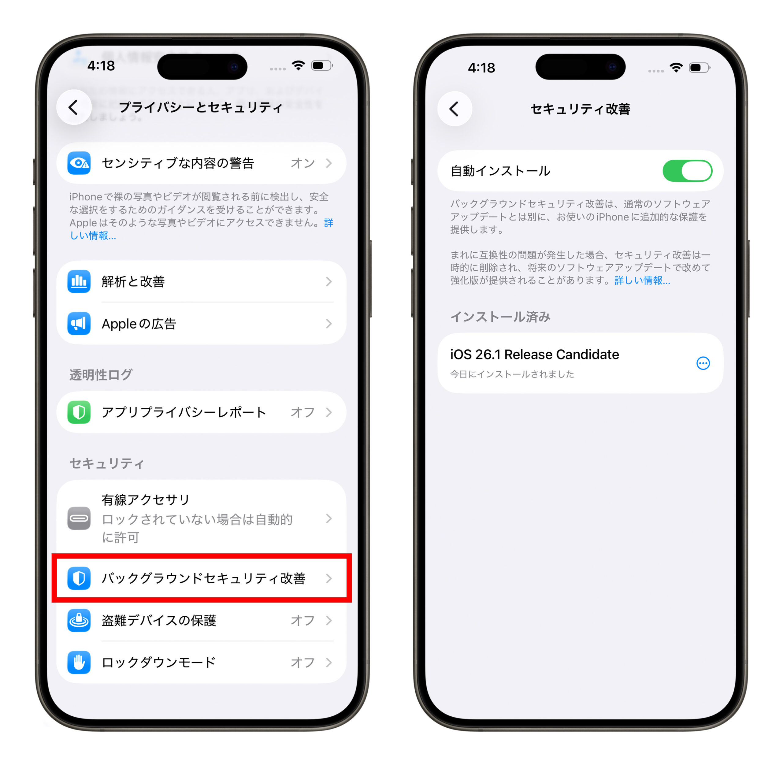 「設定 > プライバシーとセキュリティ」に「バックグラウンドセキュリティ改善」という項目が新設されました。説明文には「ソフトウェア更新間に iPhone に追加保護を提供します」とあり、インストール済みの項目に「iOS 26.1 RC」などが表示され、「…」ボタンからこのインストールファイルを直接削除できる可能性があることが記載されています。実際に削除を試みたユーザーは変化を感じていないという報告もあり、この機能の実際の挙動は今後明らかになるでしょう。