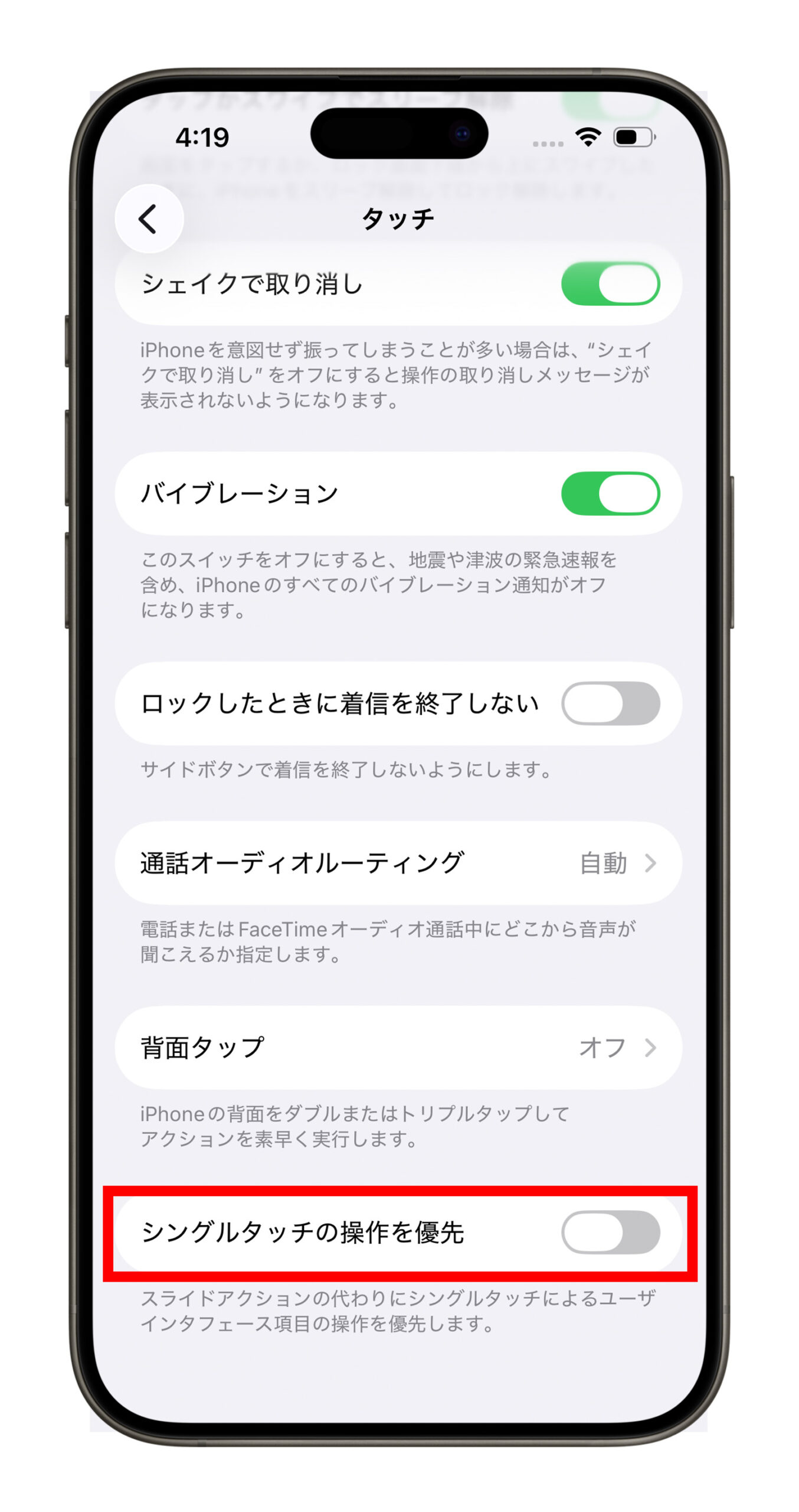 アクセシビリティ機能において、iOS 26.1 では「シングルタッチの操作を優先」というスイッチが追加されました。これをオンにすると、スワイプ操作を控え、単タップでの操作が優先されるインターフェースになります。特定の操作が難しいユーザーに向けた配慮です。