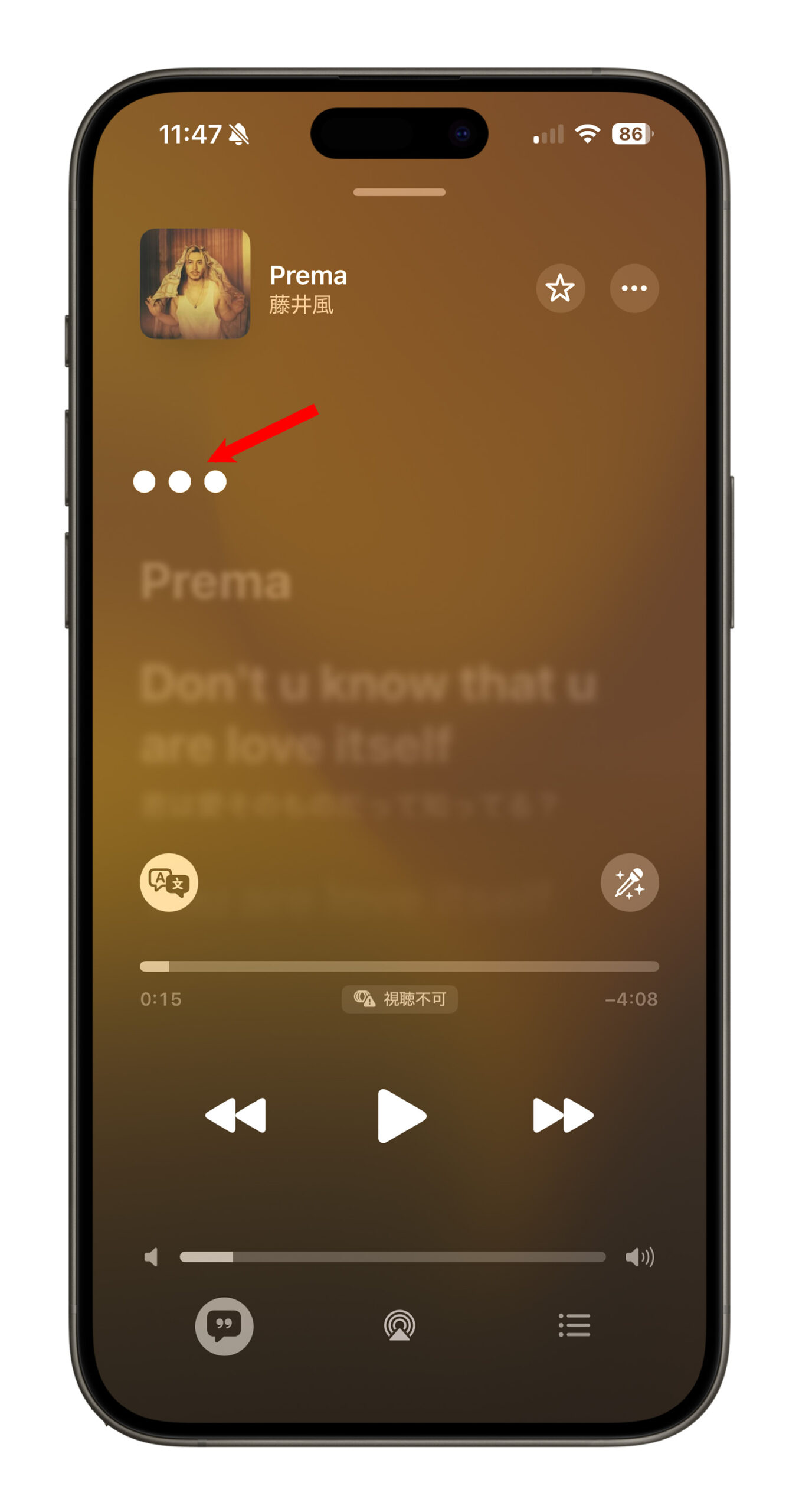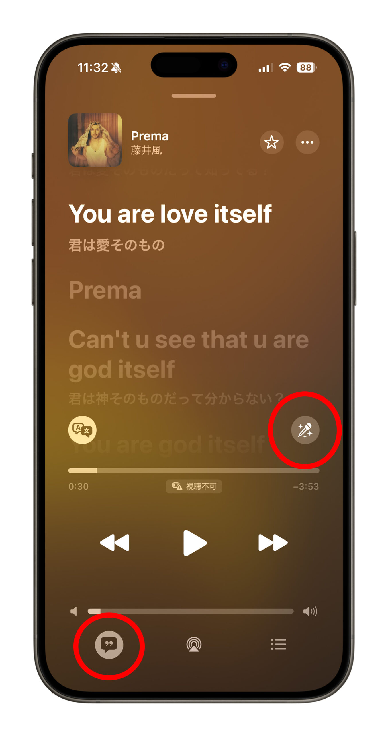 - 再生画面の左下にある「歌詞」ボタンをタップし、動く歌詞画面に切り替えます。