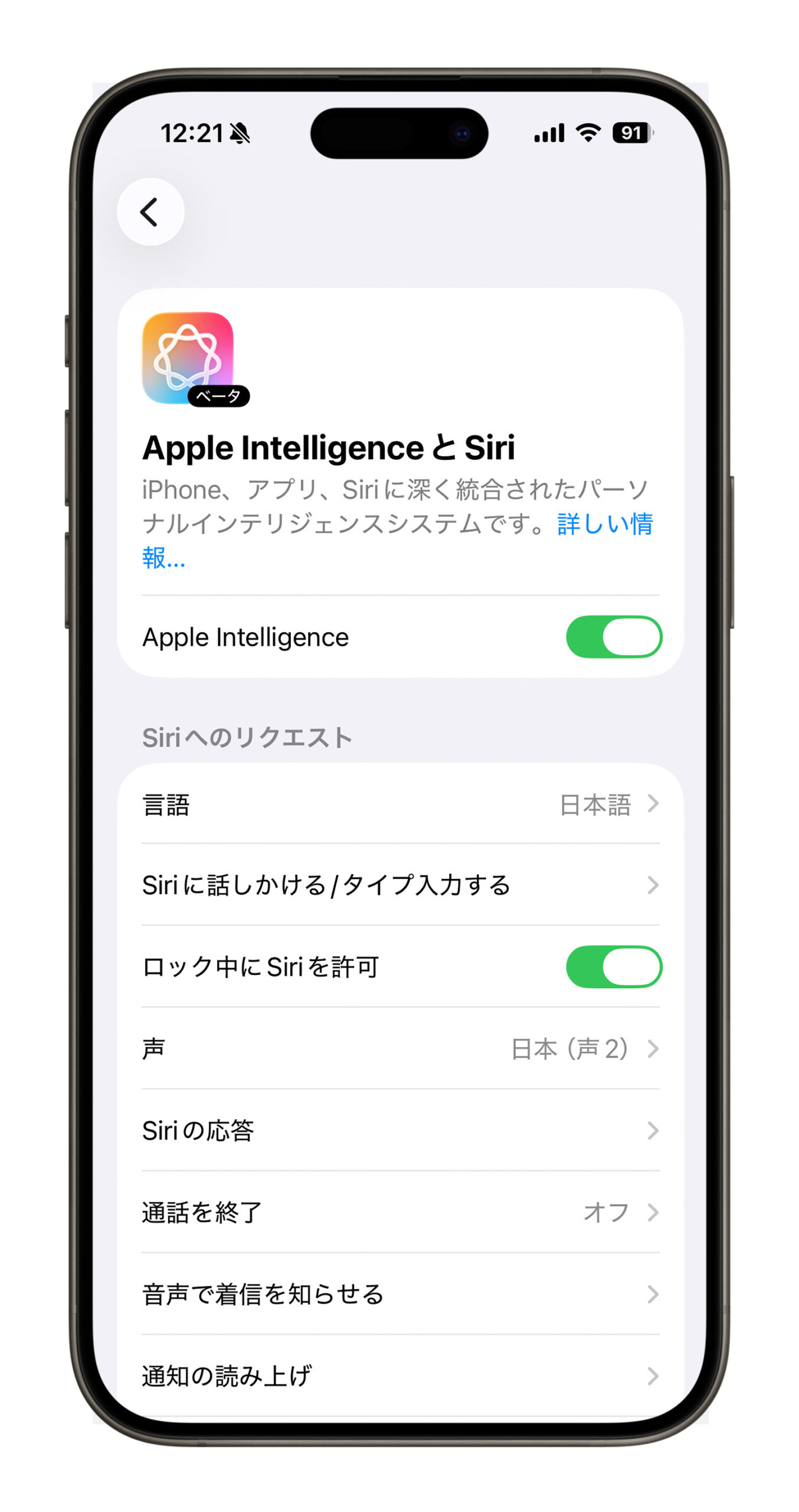 - 機能を有効化:「設定」→「Apple Intelligence と Siri」→「オン」にする。