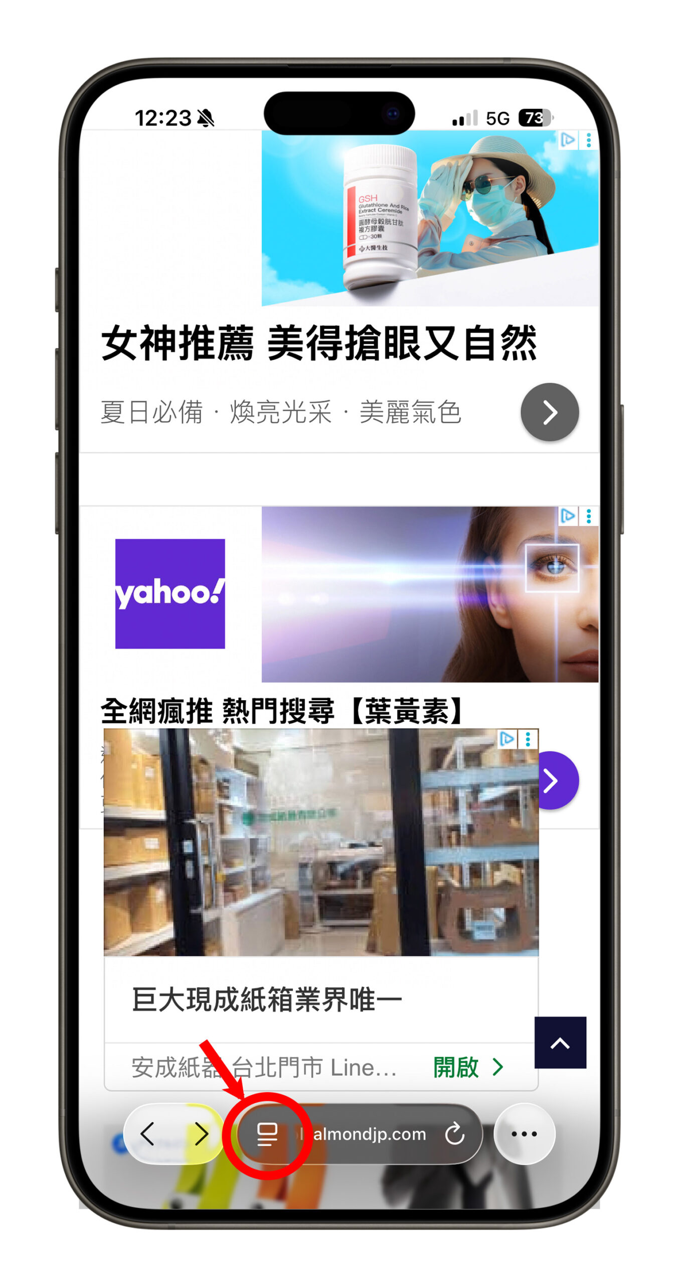 Safari で任意のページを開きます。記事を読んでいて下部に目障りな広告が出てきたら、アドレスバーの左ににあるアイコン(その他の機能)をタップします。