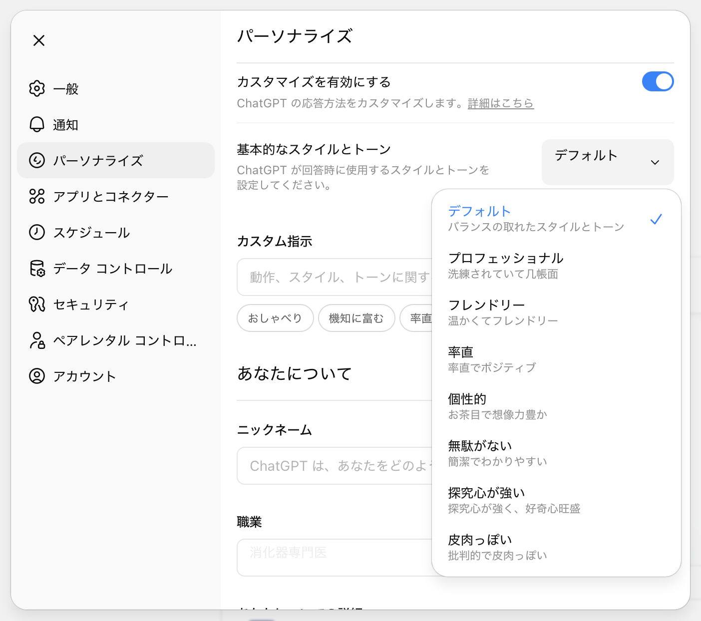 これらの設定は、ChatGPT の設定メニューにある「パーソナライズ」からカスタム機能をオンにすることで、基本となるスタイルや語調を選択できます。