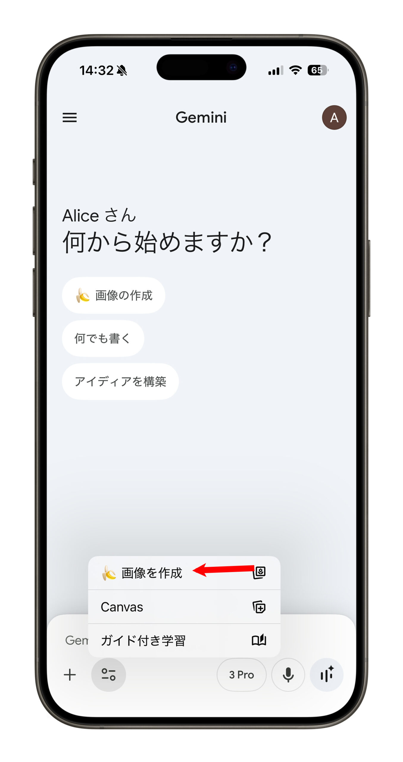 現在、Nano Banana Pro は Gemini アプリおよびウェブ版の「画像を作成」機能に統合されています。無料ユーザーにも基本的な利用枠がありますが多くはなく、私の場合は 3 枚ほど画像を生成した時点で利用できなくなり、枠を使い切ると旧版の Nano Banana に切り替わりました。