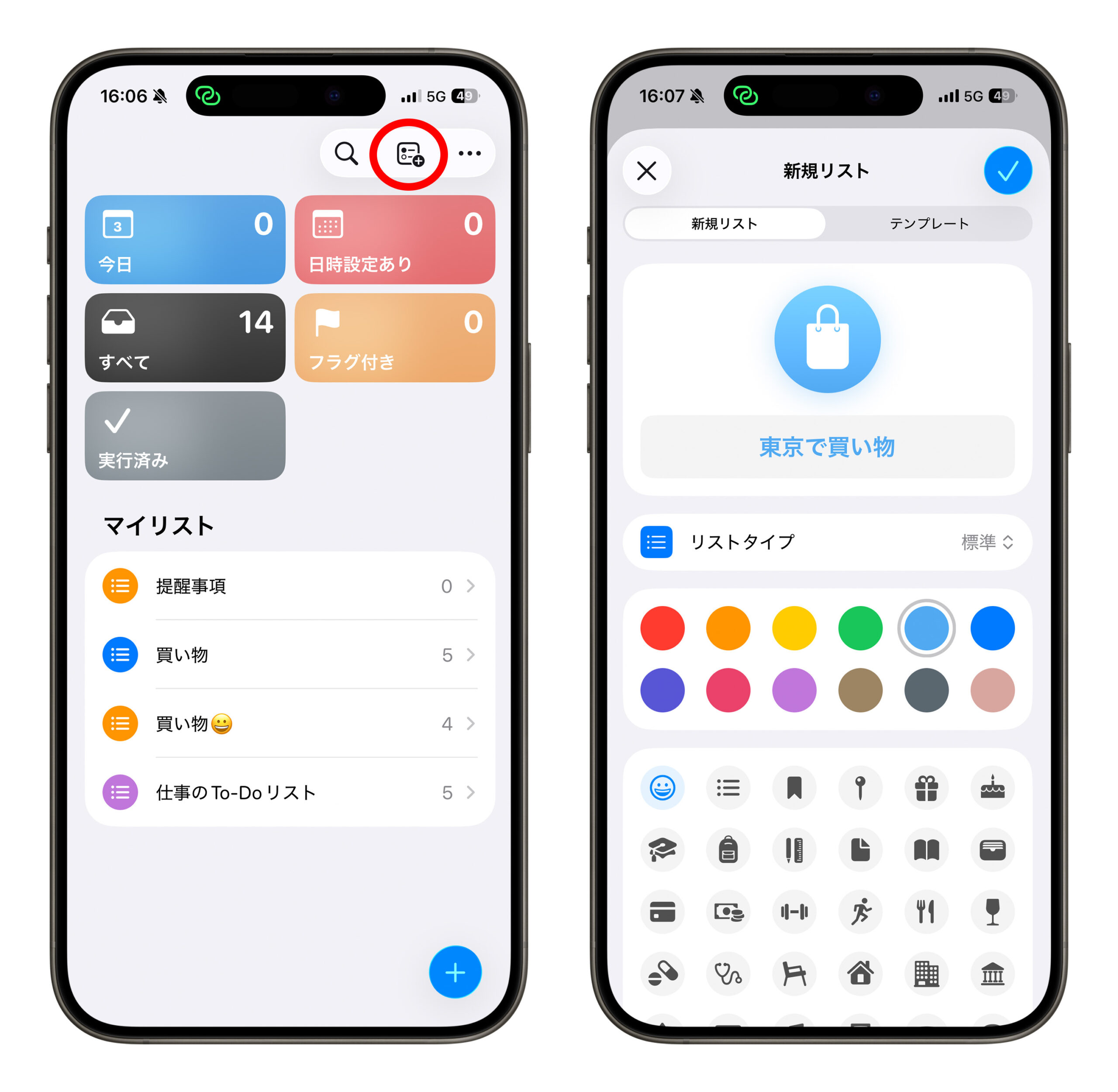 まず、標準アプリの「リマインダー」を開き、右上の虫眼鏡の横にある「リストを追加」をタップして、今回の旅行専用のリストを作ります。