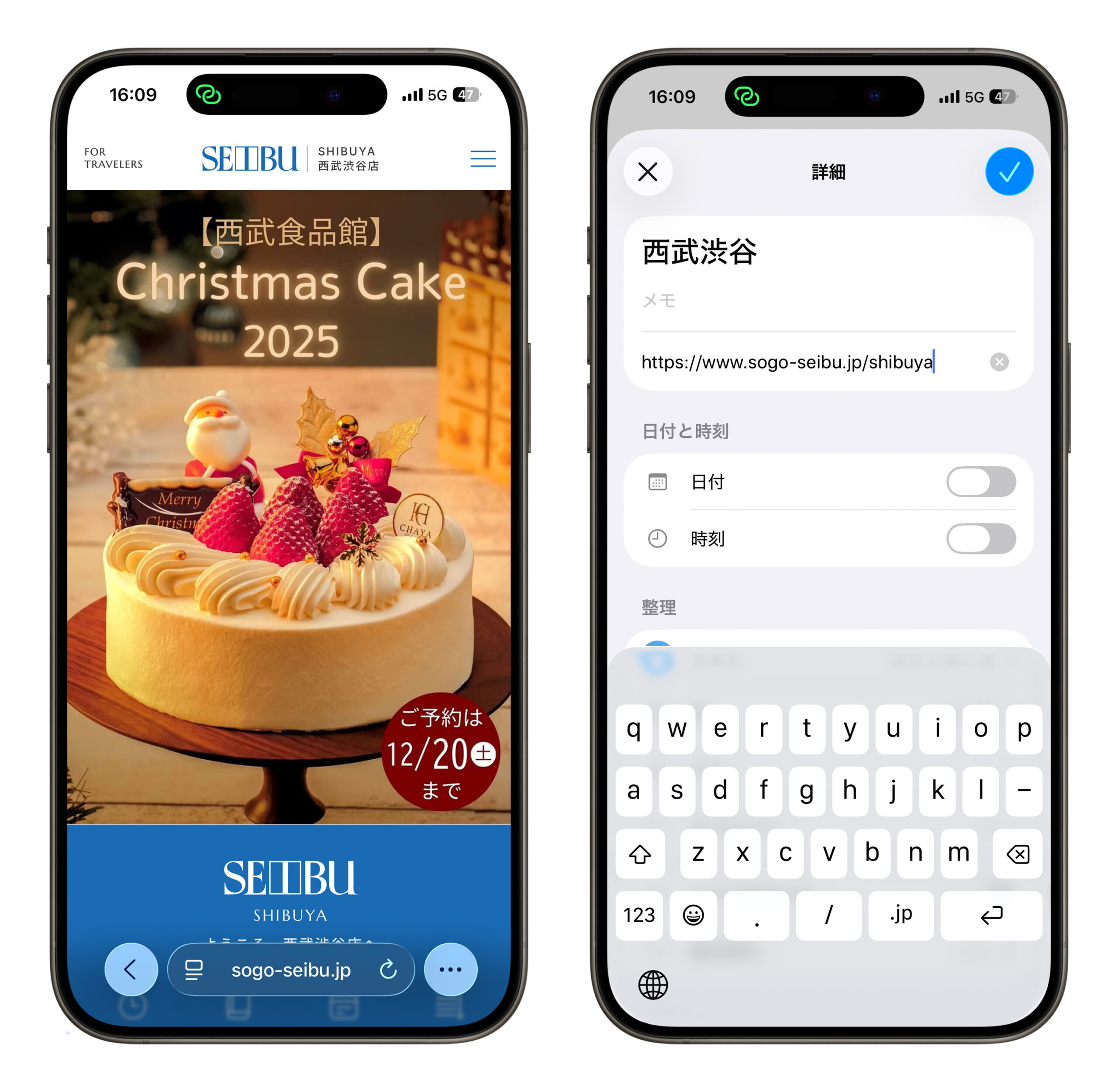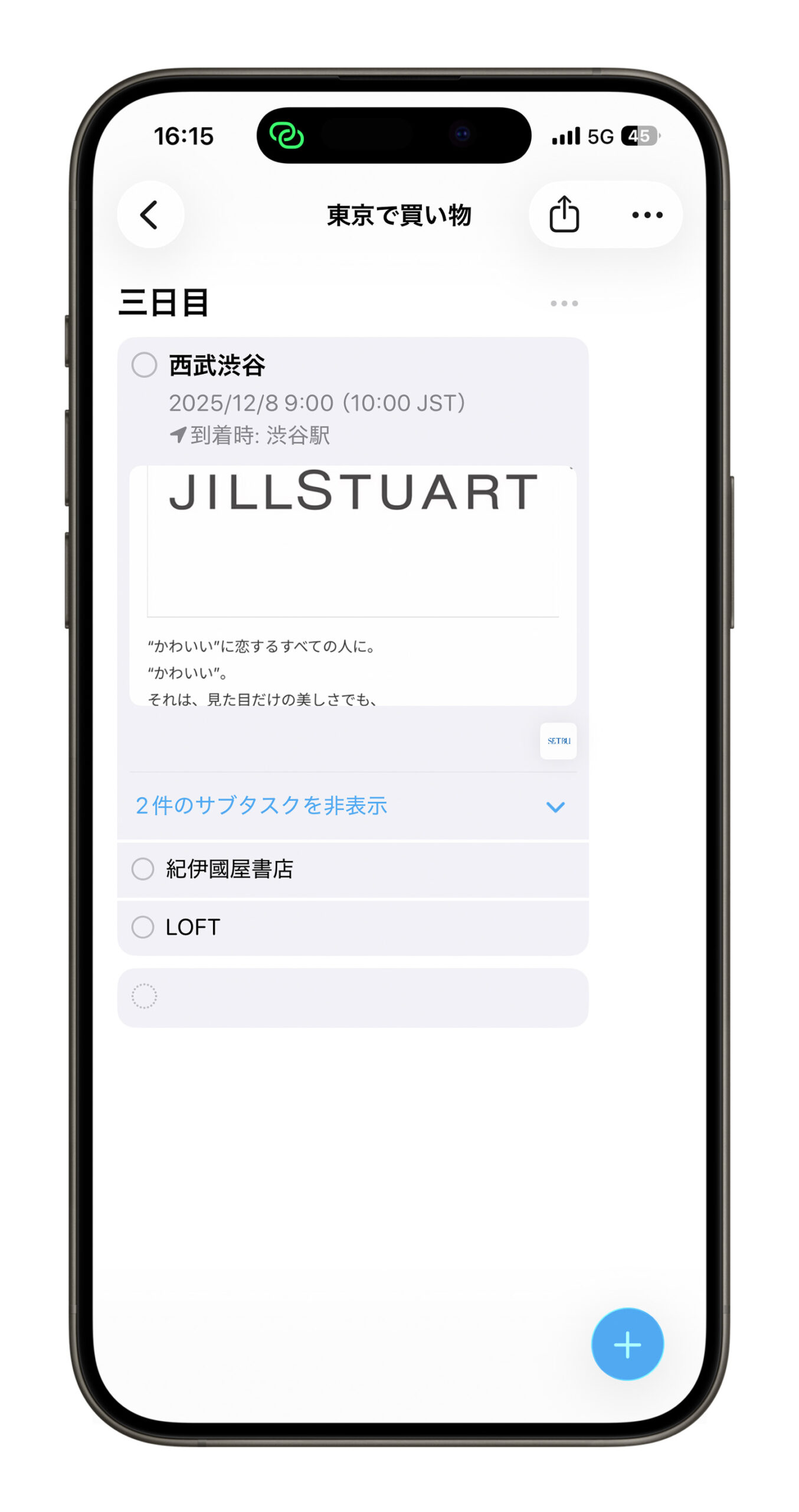 タイトル、時間、場所、写真、サブタスク、右下の小さな四角は URL のサムネイルで、タップするとそのサイトにアクセスできます。