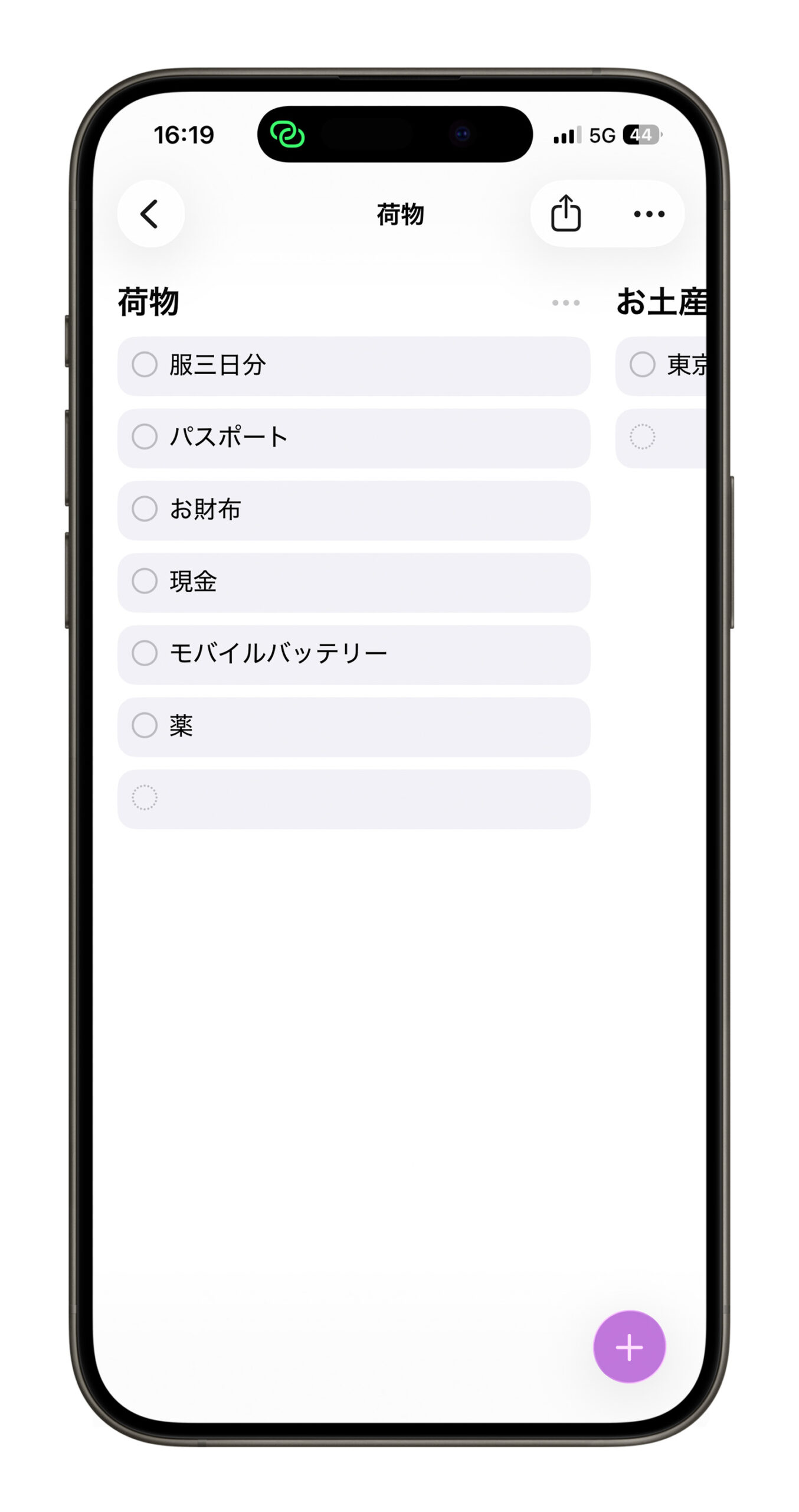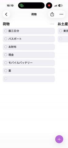 例:旅行に必要な持ち物リストを作り、「荷物」「買い物」「お土産代行」などをカラムごとに分けるだけで、すっきりしたリストが完成します。追加設定は不要です。