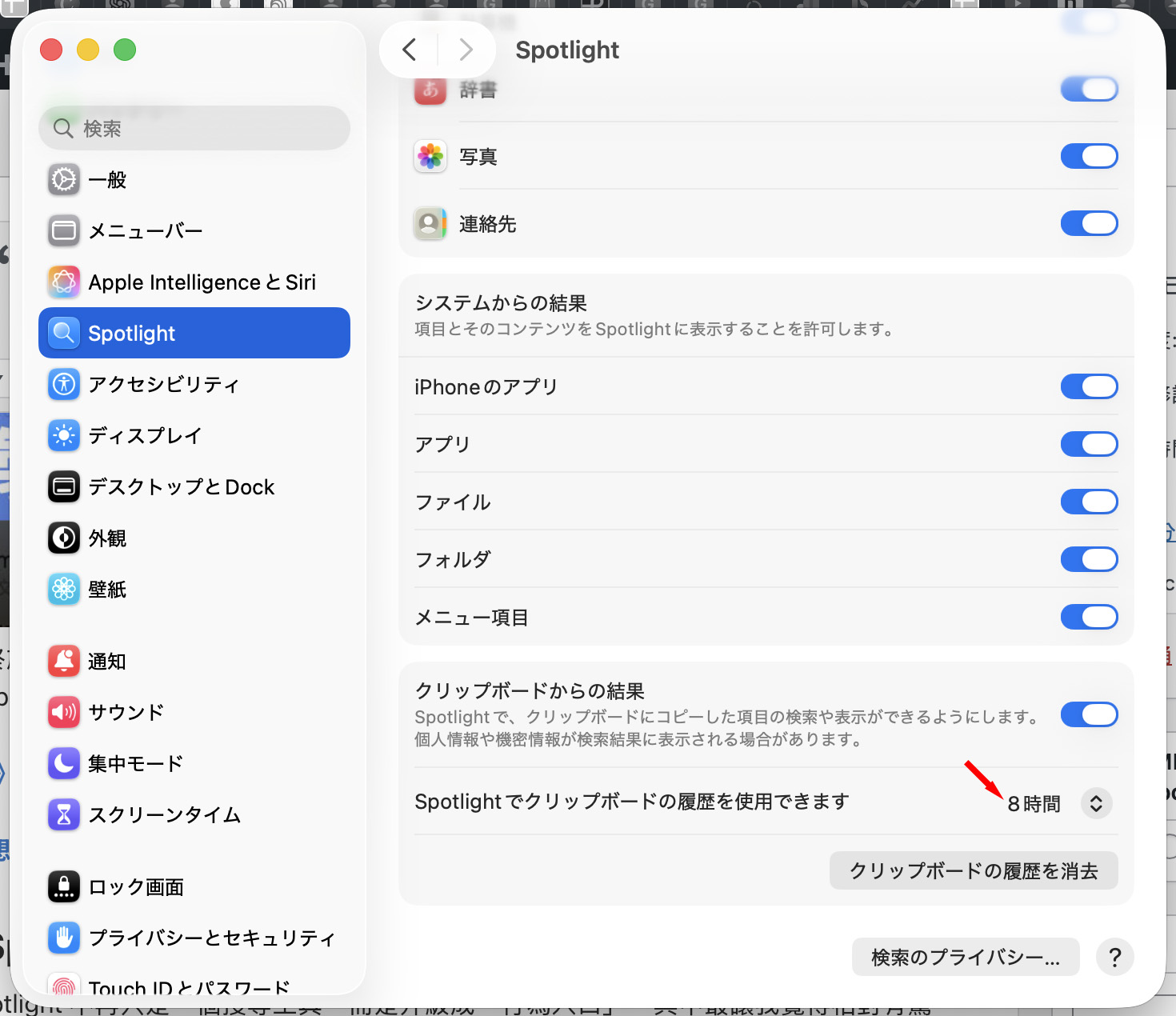 クリップボードにより多くの履歴を残したい場合は、設定 > Spotlight を開き、下までスクロールして「Spotlight でクリップボード履歴を使用」を設定します。