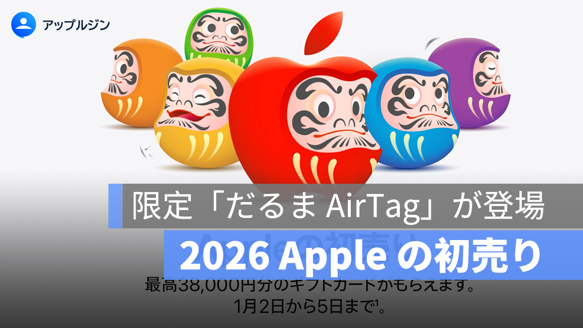 日本の Apple は 2026 年 1 月 2 日~1 月 5 日の期間に初売りを実施すると発表しました。対象製品を購入すると、最大38,000円分のギフトカードがもらえるほか、数量限定の「だるま AirTag」を無料で受け取ることができます。